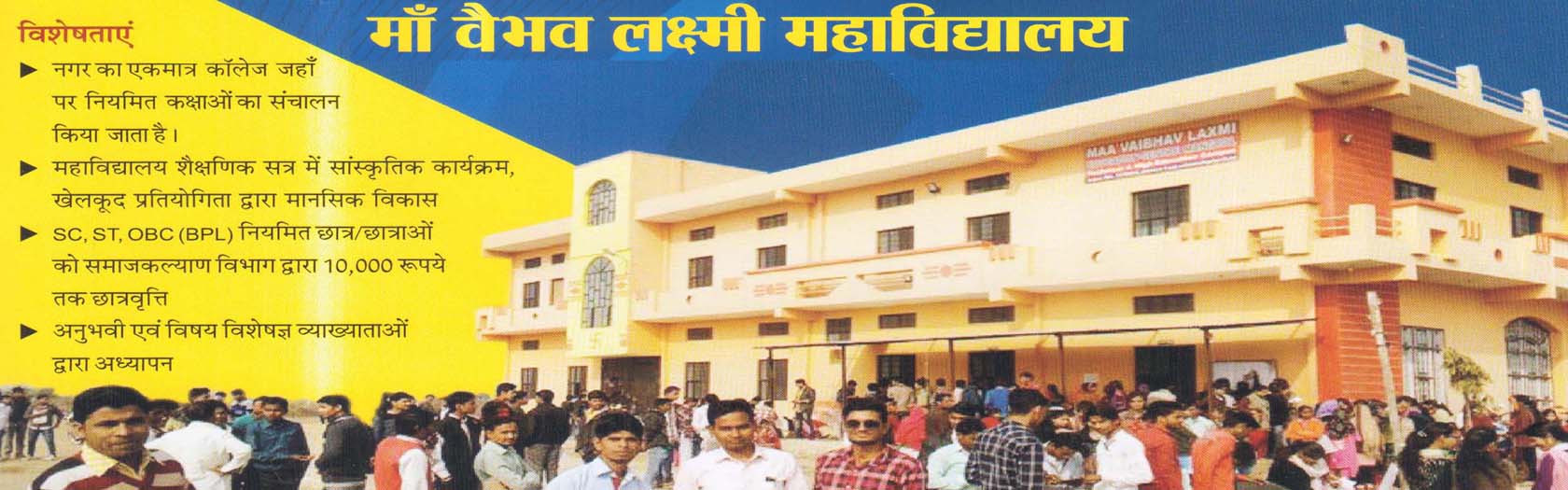 Maa Vaibhav Laxmi College established in the year 2010, under the unique heritage of Shri Yamuna Siksha & Jan Seva Samittee, Ayana Kota (Raj.). The Society was registered under Rajasthan Societies. The jurisdiction of the Samittee is entire Baran District. The registered office of the Samitteeis located at Shri Yamuna Siksha & Jan Seva Samitte, Ayana Kota (Raj.). was established in the year 2010, under the esteem guidance of Pramesh Chand Meena, Director and an eminent visionary Social Cause Kota. Shri Yamuna Siksha & Jan Seva Samittee is a premier trust body operating in the field of education since last more than 8 years. Samittee has created vast and varieties of the educational facilities under its domain that a parent can enroll his student in College and take his young one after graduation or post-graduation without shifting.